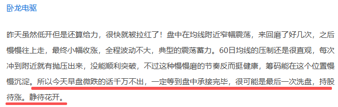 卧龙电驱今天竞价表现不错,直接高开并一举突破了60日均线的压制位。开盘后震荡上行,走势比预期更强。盘前也提醒过大家,哪怕早盘出现微跌也不要轻易下车,要等盘中承接完成,今天很可能是最后一次洗盘。结果走势也确实给力,直接走出了一波小加速,盘中一度超过6个点,稳稳地拿捏了这波走势。看到这里的小伙伴,新来的记得把小关点上,跟上节奏不会让大家失望的。