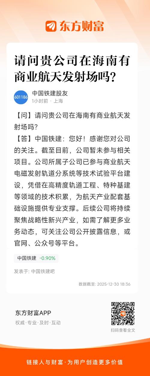 您好!感谢您对公司的关注。截至目前,公司暂未参与相关项目。公司所属子公司已参与商业航天电磁发射轨道分系统等技术试验平台建设,凭借在高精度轨道工程、特种基建等领域的技术积累,为航天产业配套基础设施提供专业支撑。后续公司将持续聚焦战略性新兴产业,如需了解更多业务动态,可关注公司公开披露信息,或官网、公众号等平台。