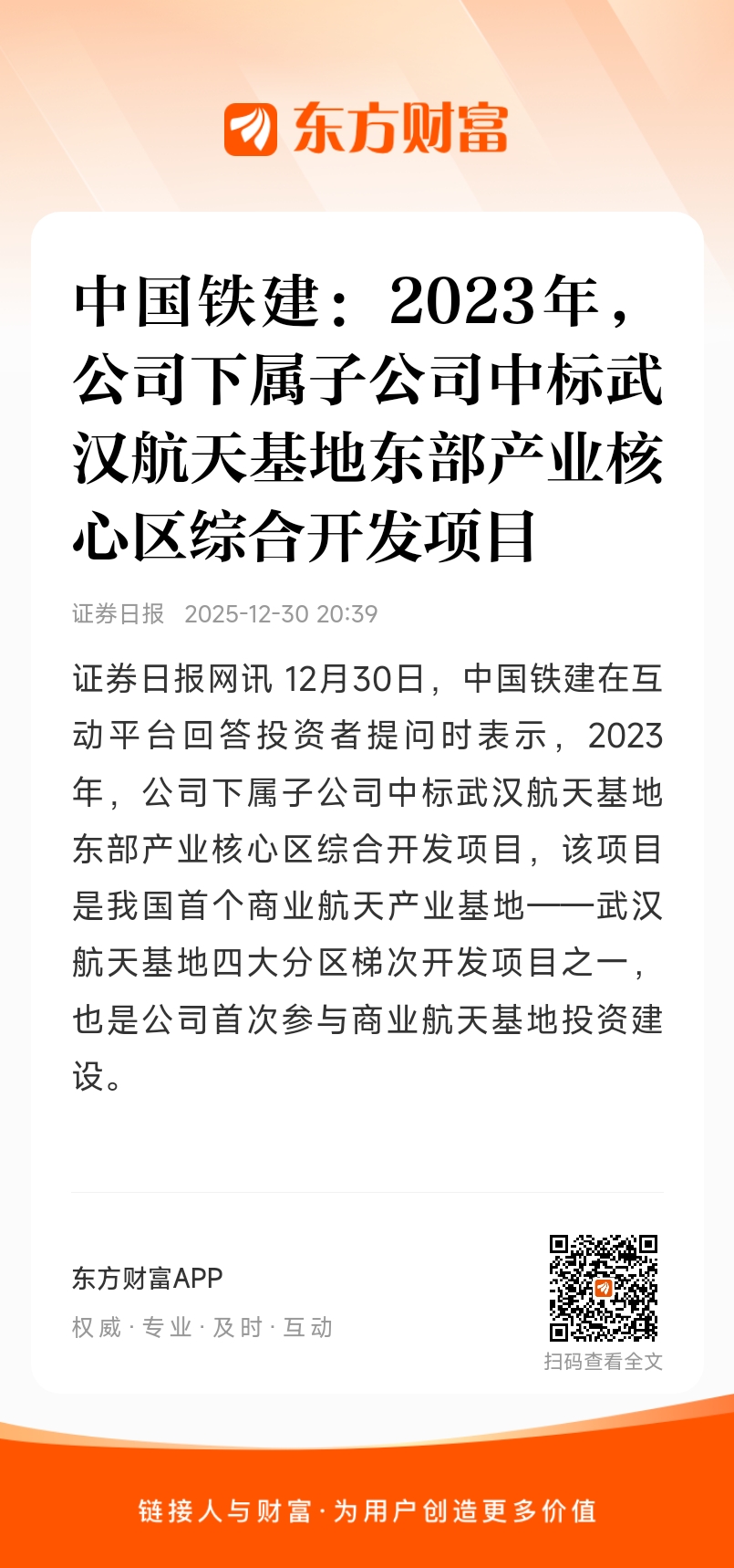 证券日报网讯 12月30日,中国铁建在互动平台回答投资者提问时表示,2023年,公司下属子公司中标武汉航天基地东部产业核心区综合开发项目,该项目是我国首个商业航天产业基地——武汉航天基地四大分区梯次开发项目之一,也是公司首次参与商业航天基地投资建设。