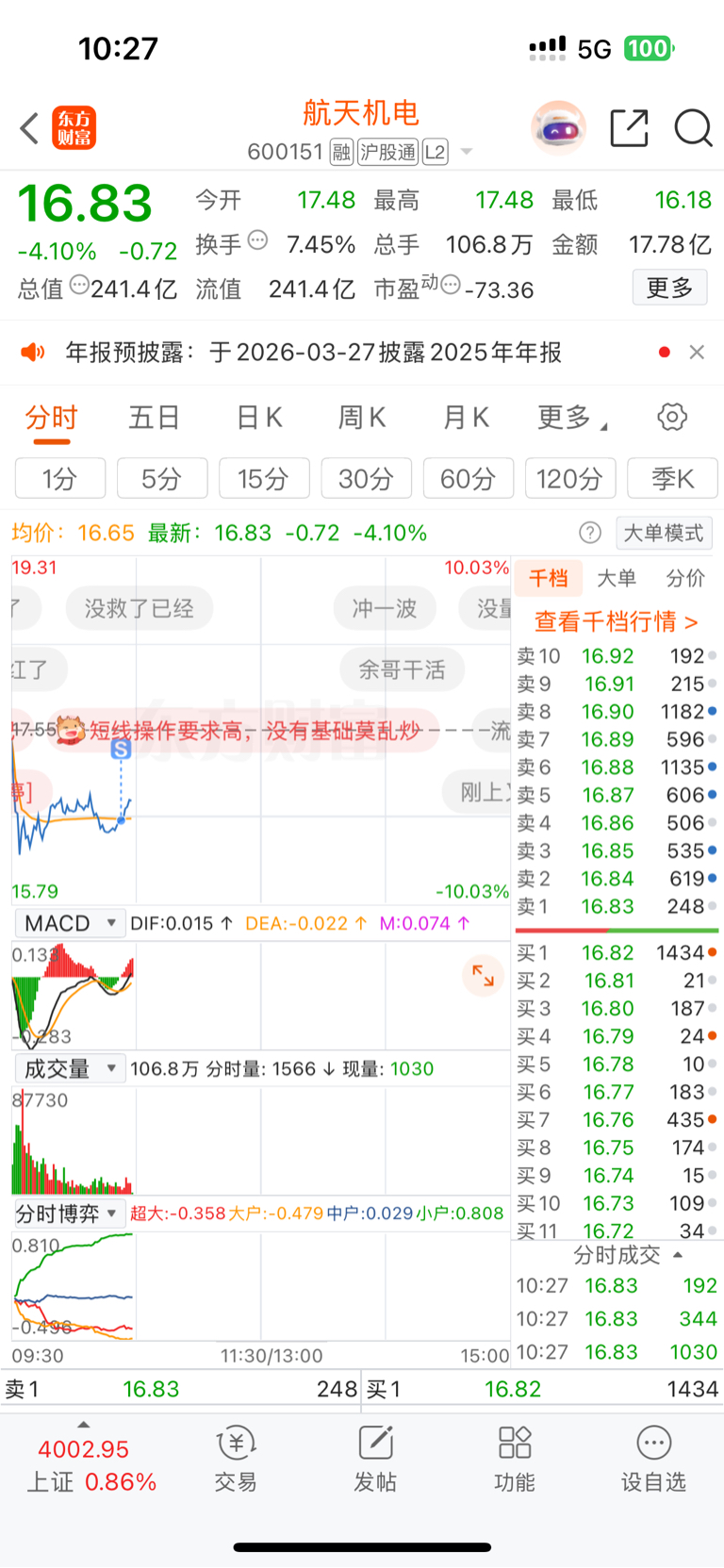 温馨提示: 1.根据《证券法》规定,禁止编造、传播虚假信息或者误导性信息,扰乱证券市场;2.用户在本社区发表的所有资料、言论等仅代表个人观点,与本网站立场无关,不对您构成任何投资建议。用户应基于自己的独立判断,自行决定证券投资并承担相应风险。《东方财富社区管理规定》