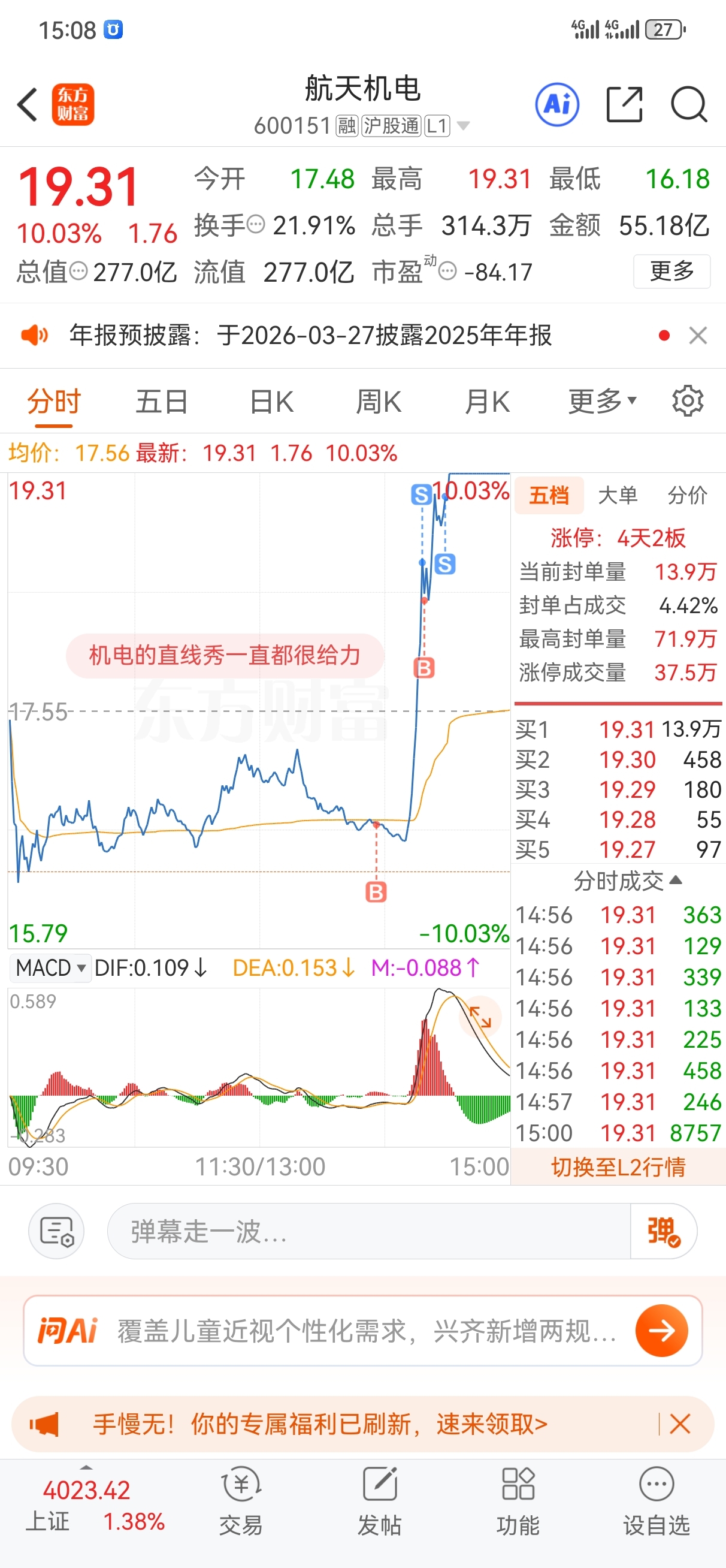 快涨停了,我知道人不能太贪心,要给主力返利,主力让我抄底成功,做T成功,我不能只等着主力拉涨停,于是在19.14的时候把剩下一半的仓位抛出来。一个原因是防止风险,我确实怕回调。还有一个原因是我知道很多时候只有散户卖了主力才会拉涨停,那就让我来当那个散户吧,反正今天赚的足够了