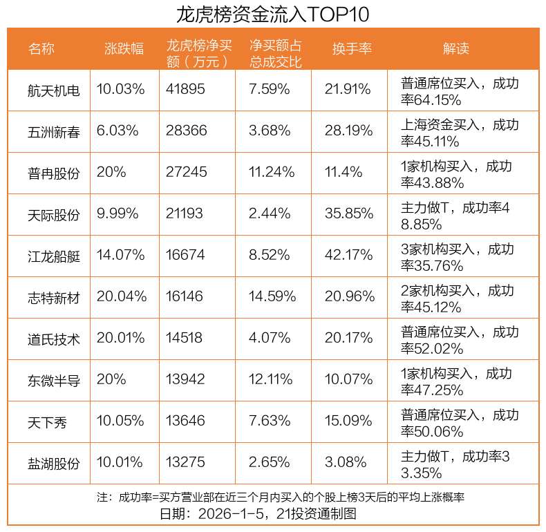 1月5日,上证指数上涨1.38%,深证成指上涨2.24%,创业板指上涨2.85%。盘后龙虎榜数据显示,共有60只个股因当日异动登上龙虎榜,资金净流入最多的是航天机电(600151.SH),达4.19亿元。