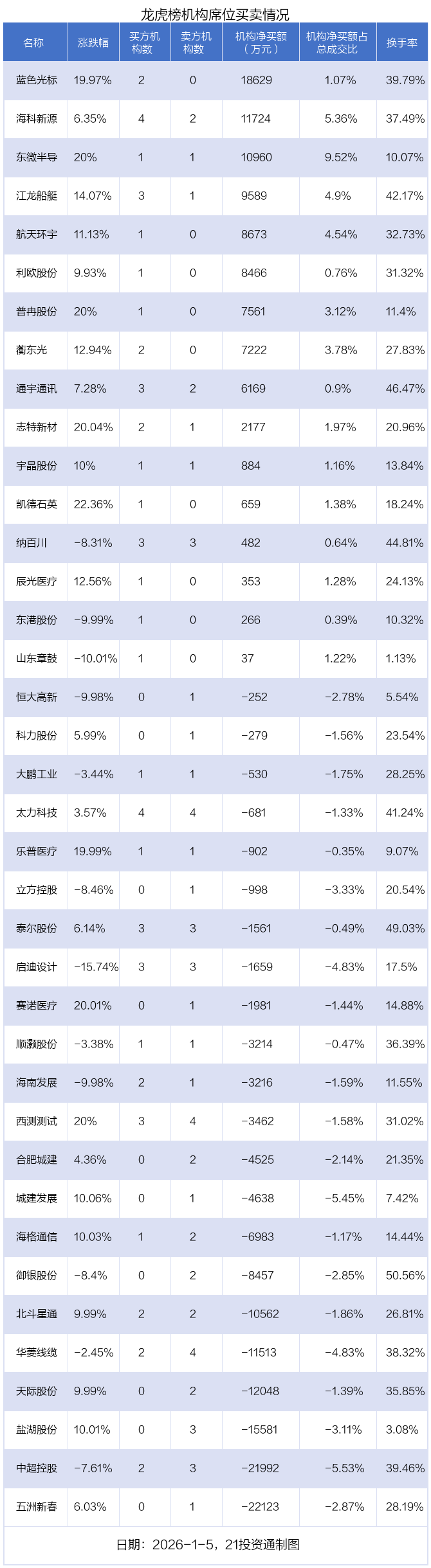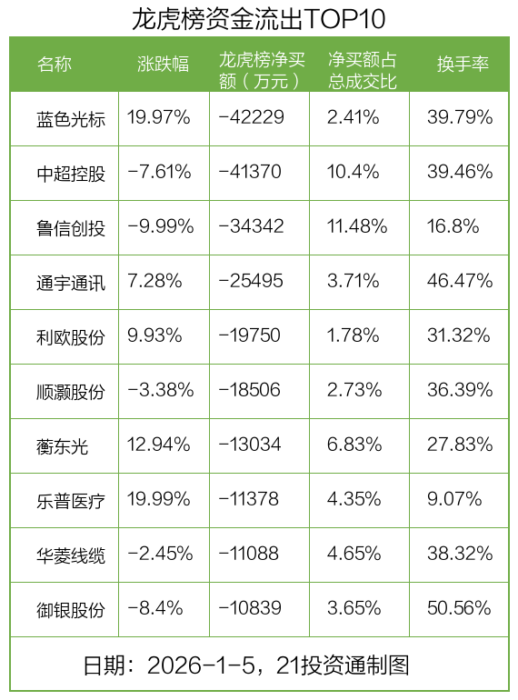 1月5日,38只个股龙虎榜出现了机构的身影,机构合计净卖出4.33亿元。具体来看,机构净买入16股,净卖出22股。