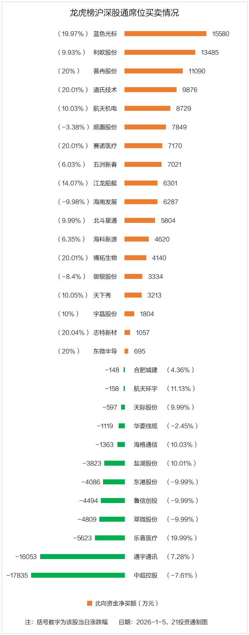 1月5日,北向资金参与龙虎榜中的个股共有30只,合计净买入5.79亿元。其中沪股通净买入7 股,净卖出3 股,合计净买入3.26亿元;深股通净买入11 股,净卖出9 股,合计净买入2.54亿元。