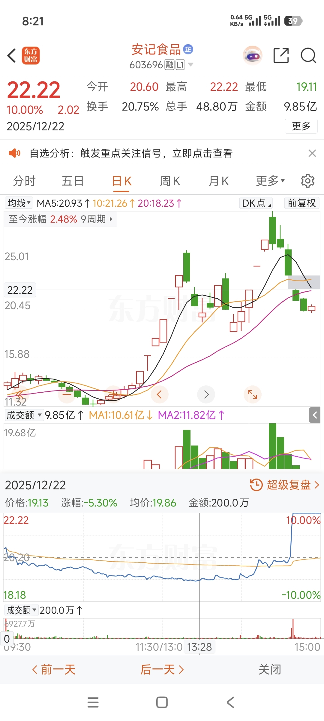 安记食品也是尾盘涨停上午一天水下下午尾盘涨停后面三个板一模一样走法会不会这么走看