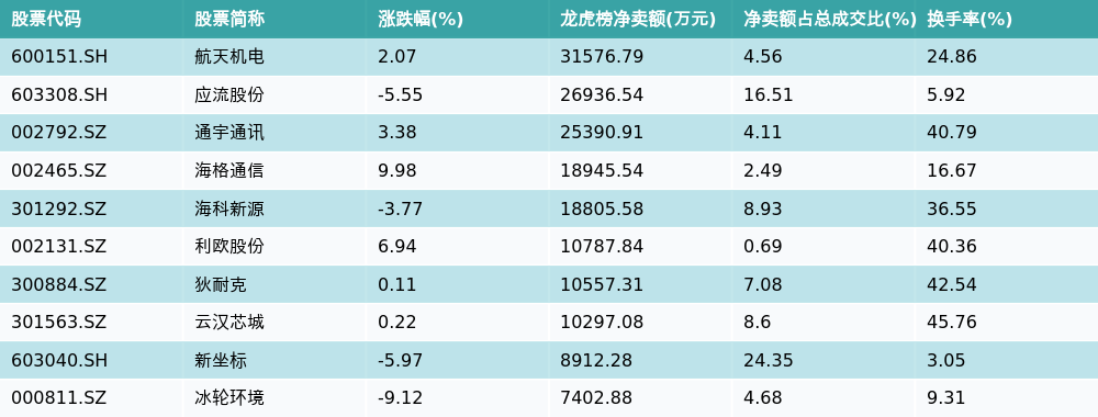 南财智讯1月6日电,南财金融终端数据显示,因当日异动登上龙虎榜的个股中,龙虎榜中资金净流出最多的前三位分别是航天机电(600151.SH)、应流股份(603308.SH)与通宇通讯(002792.SZ)。其中排名第一的航天机电被净卖出3.16亿元,占总成交金额的4.56%。航天机电收盘上涨2.07%,换手率为24.86%。净卖出额前10个股详情见下图: