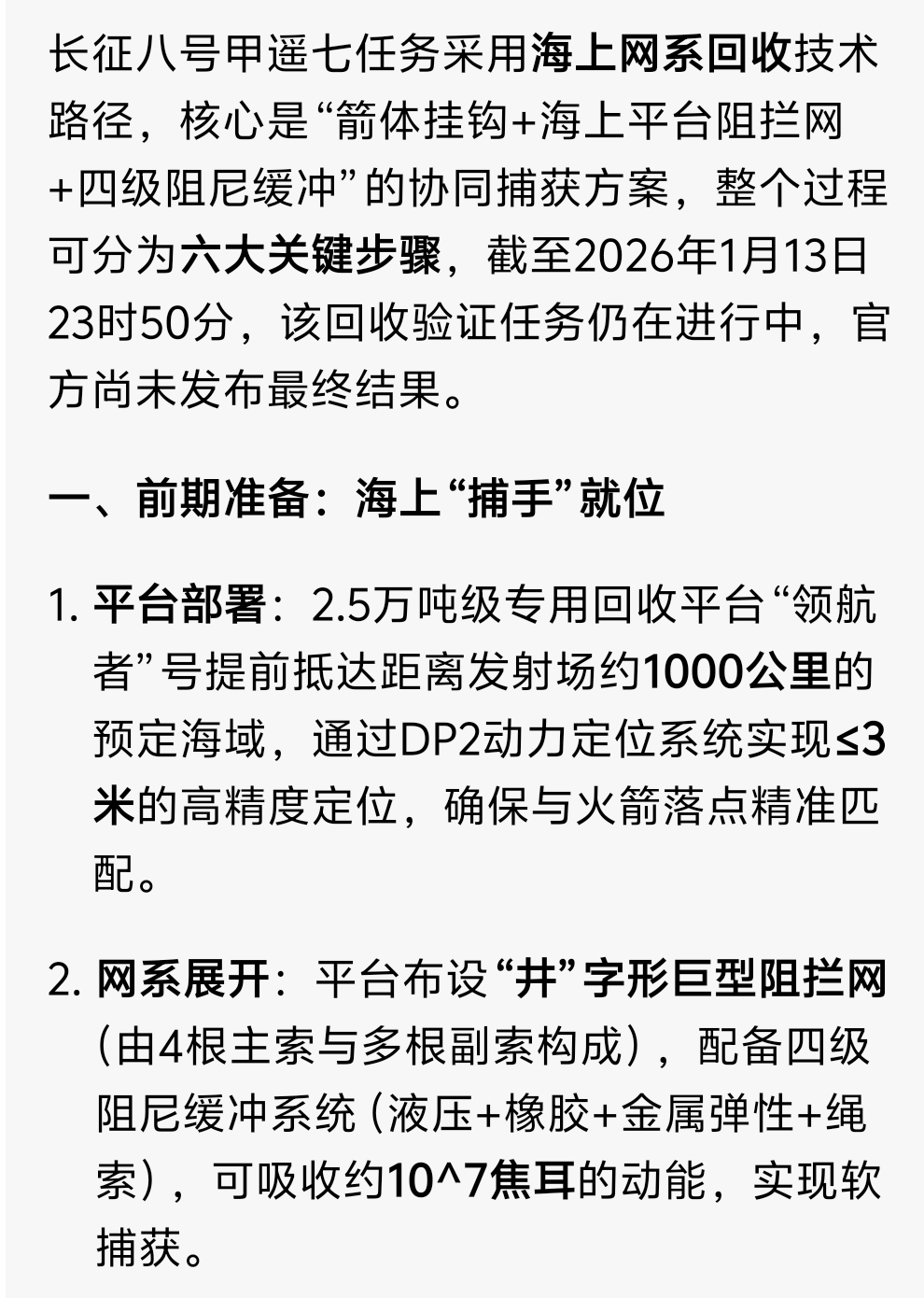 $航天机电(SH600151)$ 长征八号甲遥七任务采用海上网系回收技术路径,核心是“箭体挂钩+海上平台阻拦网+四级阻尼缓冲”的协同捕获方案,整个过程可分为六大关键步骤,截至2026年1月13日23时50分,该回收验证任务仍在进行中,官方尚未发布最终结果,谁知道成功了吗。