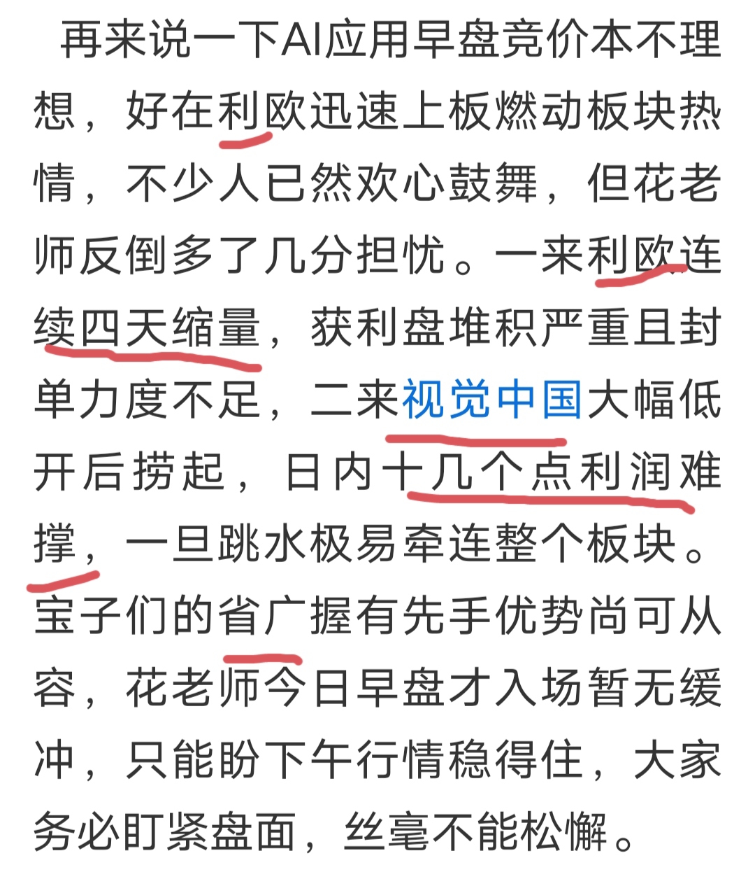 继续说AI应用,低位下午已经开始掉队,中午文章就明确提示了高位视觉中国的风险,下午果然撑不住回落。好在花老师持有的省广非常给力,稳稳扛住。明天利欧和省广将迎来正面PK,单看结构图形,省广明显更占优。两者双双晋级的概率不高,大概率是二选一,甚至板块迎来退潮,不过省广具备穿越潜质。花老师会坚定持股到尾盘最后一分钟,确认了不涨停再跑。宝子们就更不用担心了,好些老粉哪个不是三四十个鸡腿垫着,静待市场选出答案后即可。