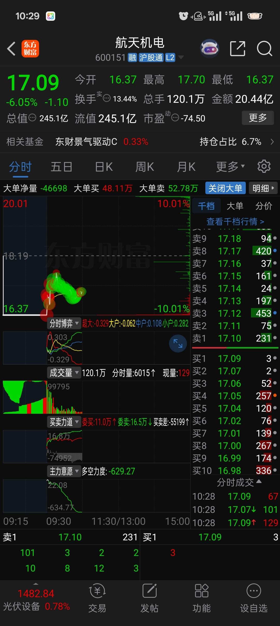 $航天机电(SH600151)$ 一波快速拉升之后,都是密集的出货,待水下时间久了,拉不起来了,尾盘不跌停就行了