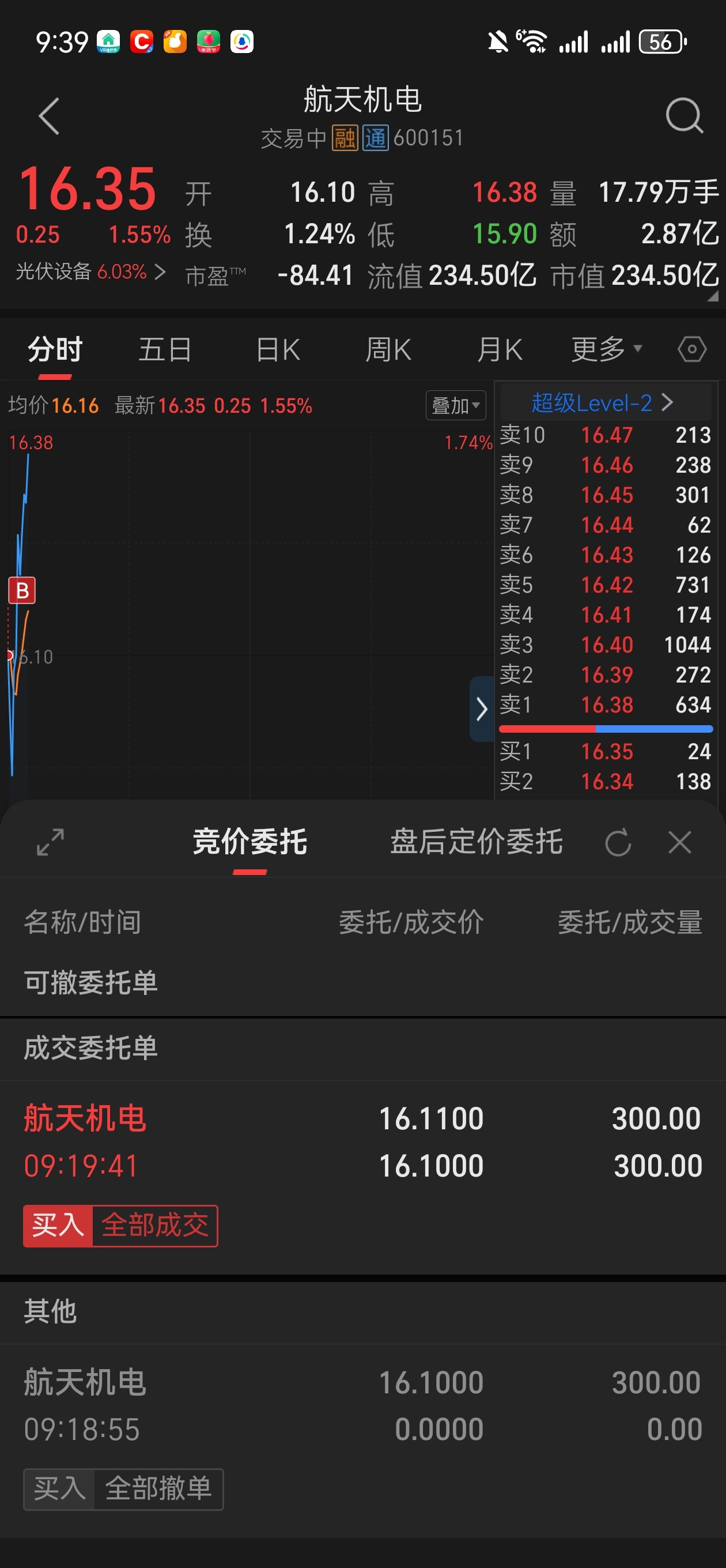 $航天机电(SH600151)$ 主力控盘能力卓越,竞价电子、卫星分别涨2点几和零点几不断波动,机电稳稳站在16.10几分钟没动,高度控盘了,好事