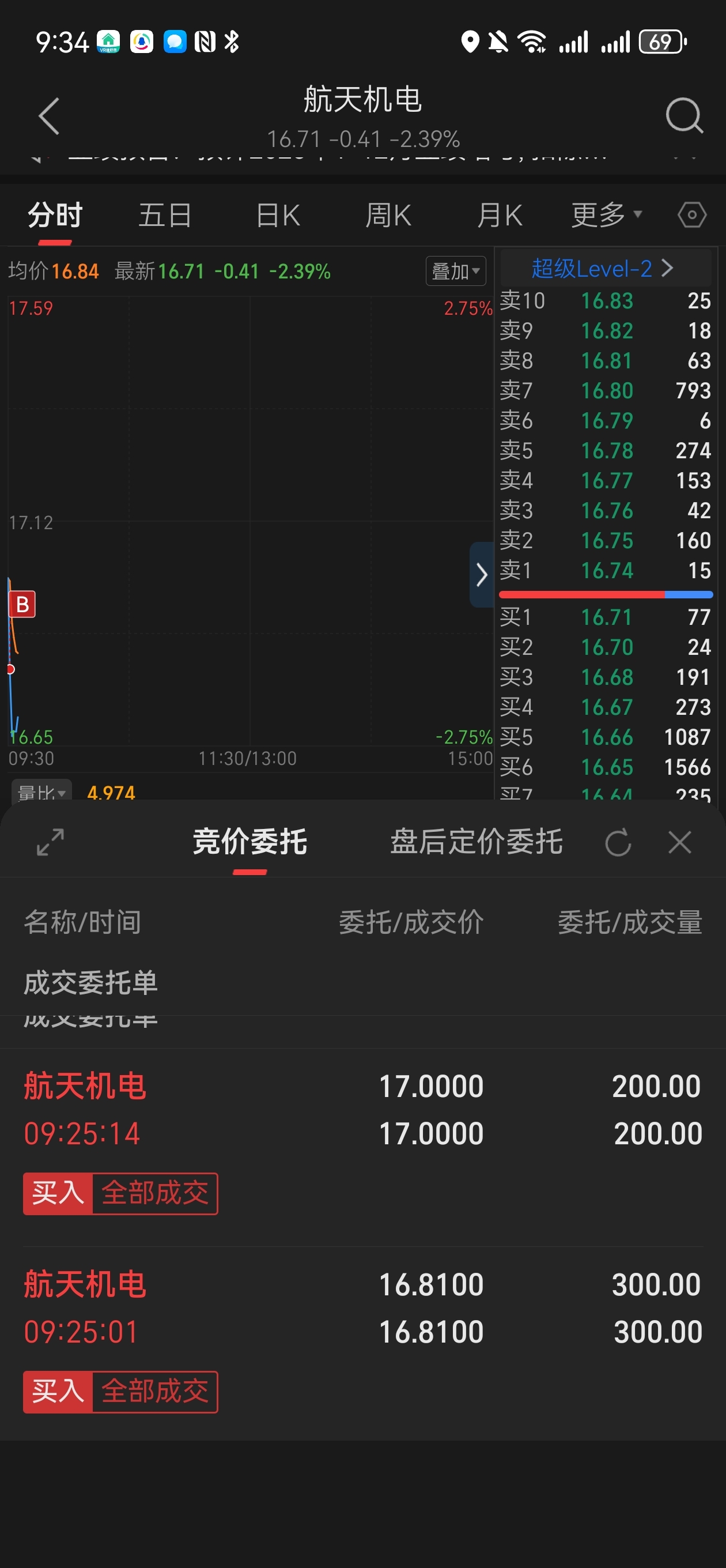$航天机电(SH600151)$ 开盘买入。和周五一样,在17块整大额抛单压制,今天开盘在17块抛单近4000手,和周五防守上攻的点位一样17块,最后被冲破,收在17块1毛2