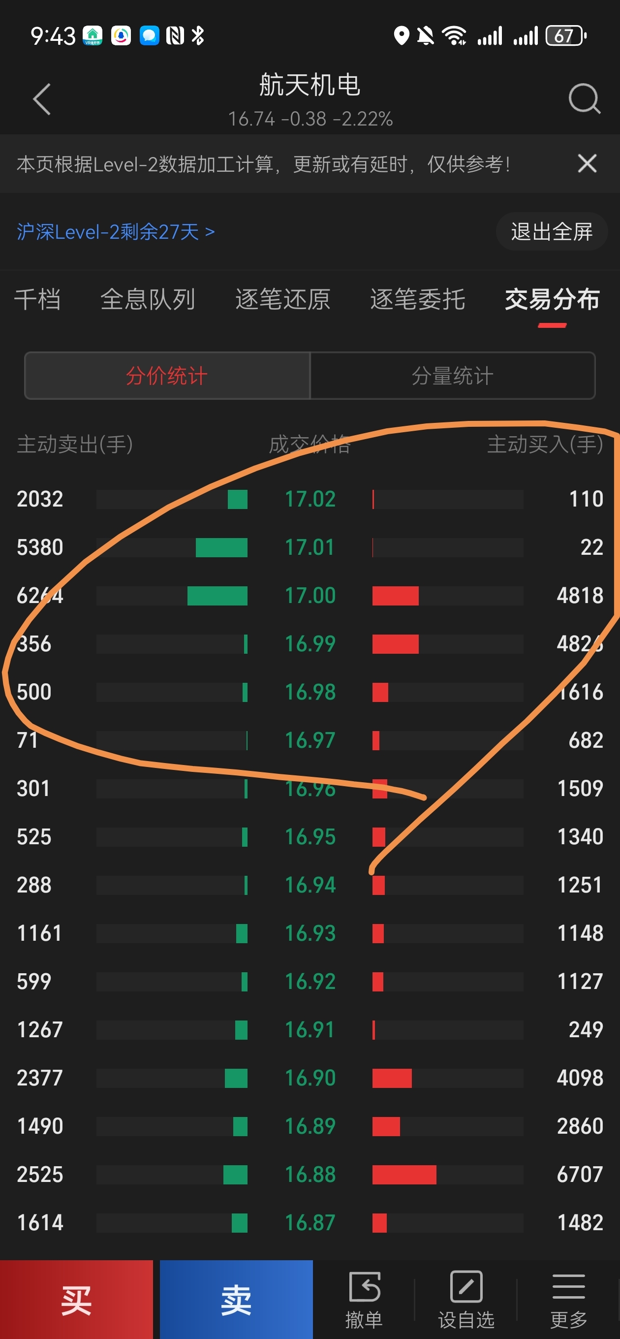 开盘买入。和周五一样,在17块整大额抛单压制,今天开盘在17块抛单近4000手,