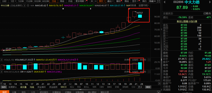 中大力德:上周五在97.57元位置涨停触顶以后,昨日盘中低开缩量,尾盘更是触及跌停位置附近,所以盘中今日首先在题材领域中,先注意机器人领域的量能变化,机器人领域要是明显向上,这只个股前期上涨,更多是跟着板块一起,那么机器人领域向上,对于个股就是支撑,盘中昨日低开缩量向下,还是主要注意量能的放量上冲,注意前期高点97.57元位置附近,但是盘中要是继续低开缩量,日线日均线走平,甚至拐头向下,K线回调明显,盘中只能短线出来,等回调企稳,再次放量,