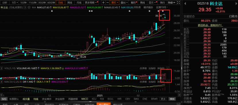 科士达:昨日在30元位置的时候,上涨受阻,量能放量,但是股价冲高回落,收小阴线,盘中明显背离触顶,不过题材领域中,储能领域从去年到今年一直在稳健上涨,中间也出现了雄韬股份和野马电池等非常上涨厉害的个股,当下储能继续稳健上涨之中,盘中继续关注储能的上涨变化,继续资金流入向上,那么在题材支撑之下,个股前期在20元位置踩着多条均线,并且日线60日均线走出向上,均线排序整齐紧凑支撑K线,量能放量拉升上涨以后,盘中注意整体前期筹码聚集的压力位30元位置突破,以及30元位置突破以后,上方通道的打开,不然短线操作。