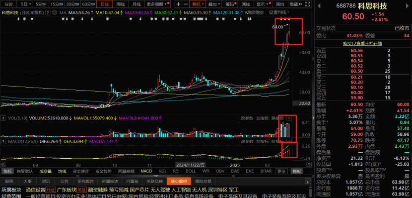科思科技:持有时间比较上的一只个股,在上周五量能放量,继续向上以后,昨日K线虽然没有踩最短的5日均线支撑,但是量能放量,股价还是收在了60元位置上方,今日盘中首先继续注意人工智能和国产芯片题材领域的量能变化,放量向上的话,那么对于个股来说,主要是注意踩着60元位置,量能的继续放量突破,首先就是注意昨天高点64元位置附近,不过个股K线已经距离5日均线有距离,昨日也是量能放量,K线收上影线较长K线,明显背离触顶信号,盘中小心回踩5日均线,让5日均线走平,缩量向下,要是如此,那么只能在上涨中,先出来一半,等后期放量向上再说。