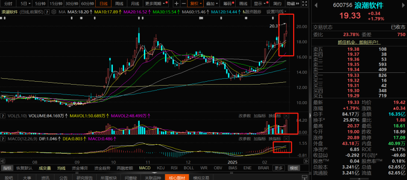 浪潮软件:AI智能体+人工智能+大数据+云计算,互联网服务;多个热点题材累加,尤其是deepseek概念,支持用户在互联网、局域网等各类环境下调用AI能力。以及当下AI+热点领域中,AI领域和其他行业的结合,共同发展,对于人工智能领域来说,也是重要的发展方向,个股上,昨日在20元位置下方收下影线较长K线,但是前期踩着120日均线14元位置附近,重新放量,突破所有均线压制以后放量向上,盘中虽然60日均线还没有走出,趋势向上,不过均线快慢线在零轴上方背离,所以盘中短周期继续注意20元位置的突破放量,以及60日均线的走出向上。