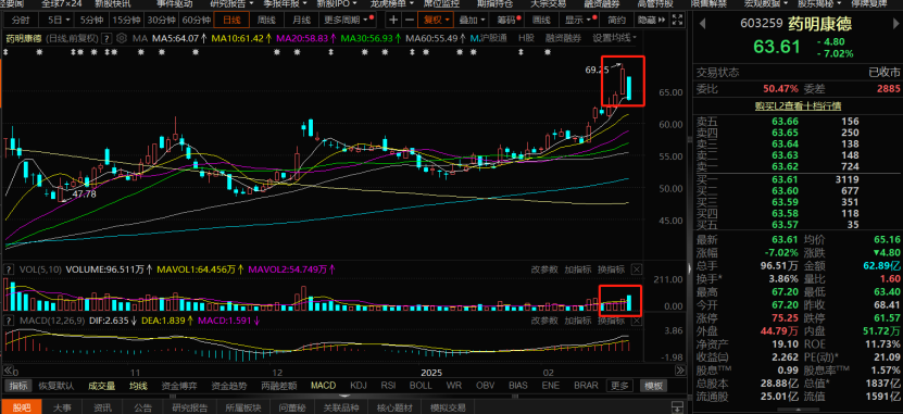 药明康德:上周五上破70元关键整数关口压力位,没有突破,在70元位置下方收盘以后,昨天盘中开盘,直接低开低走,不过因为市场已经提出了AI+在上周末的时候,对于AI+医疗行业来说,也是发展方向之一,更主要deepseek在医疗领域的广泛应用,也让医疗+科技更受到市场的关注和讨论,当下继续注意AI+医疗题材的爆发,个股还有CRO题材支撑,所以技术上短周期70元压力位没破,不过前期K线在55元位置窄幅震荡吸筹以后,踩着55元位置继续拉升向上,当下5日均线没有走平,所以盘中继续注意65元位置附近的量能变化,继续放量上冲70元压力位,继续持有,但是缩量压平5日均线,回踩其他均线支撑走弱,只能短线逢高出来。