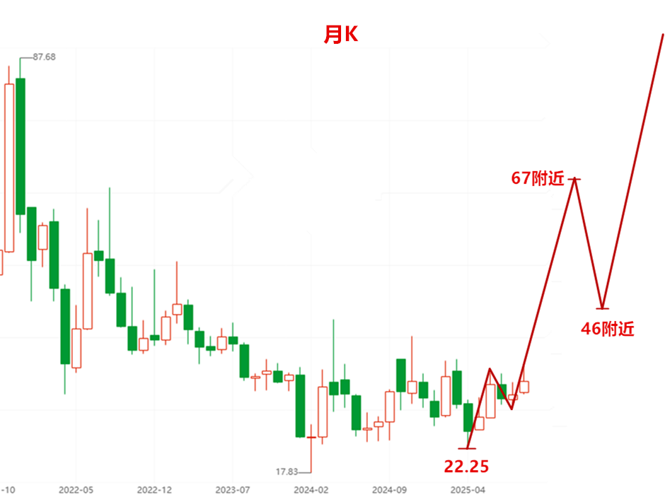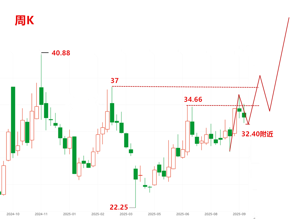 今天收33.24,向下在32.40附近再踩一下,整理基本结束;这一小波,会拉到37之上的某个位置,从而完成趋势反转;随即会向下回踩确认,这个回踩位置就是起爆点,随即会开启一波大幅上涨,高点位置67附近!