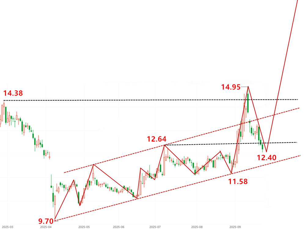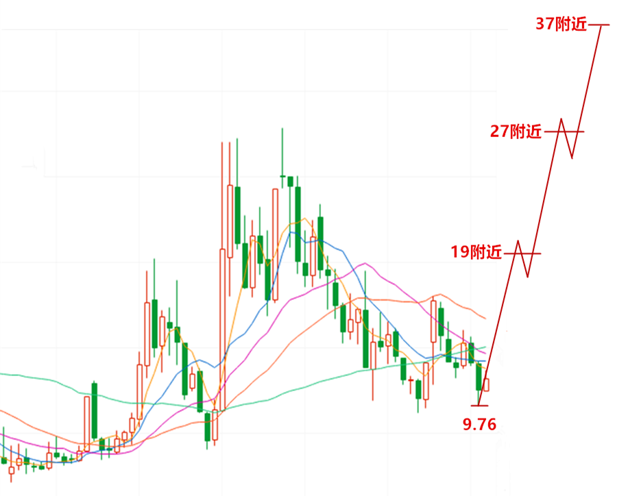 自五月震荡上推至今,先破12.64,随后突破上轨,同时破掉14.38,完成了趋势反转;目前处于突破上轨和趋势反转之后的回踩阶段!19附近,27附近,大概率调整一下,29附近见顶,三倍左右;如果超预期,37至39附近见顶。