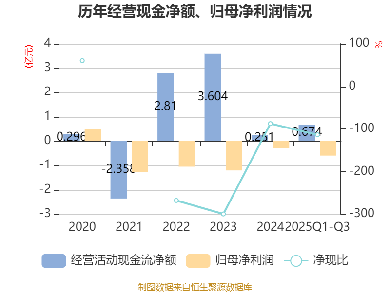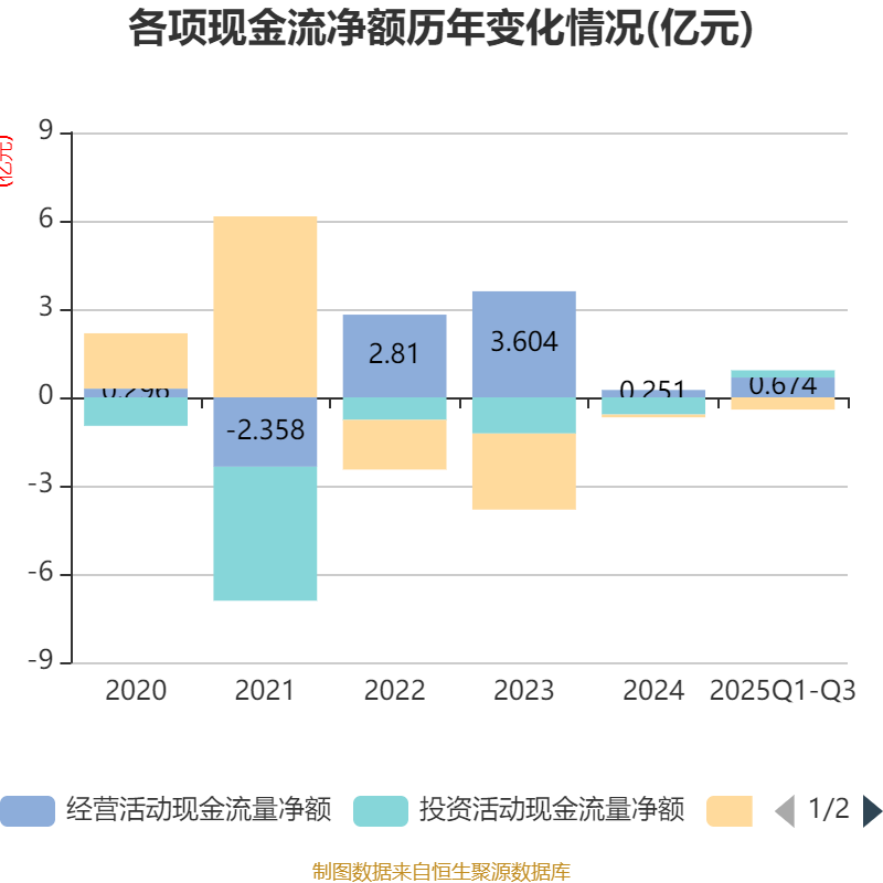 2025年前三季度,公司经营活动现金流净额为6742.14万元,同比增长836.79%;筹资活动现金流净额-4152.47万元,同比减少5345.06万元;投资活动现金流净额2454.18万元,上年同期为-6838.71万元。