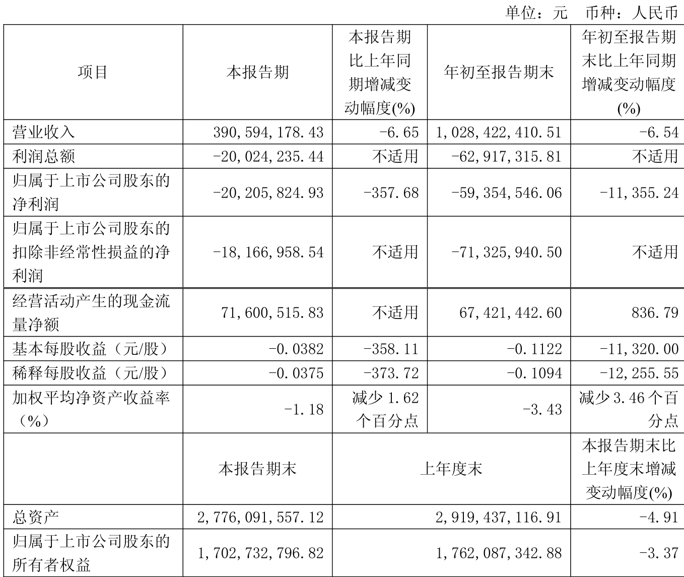 中证智能财讯维科技术(600152)10月30日披露2025年第三季度报告。前三季度公司实现营业总收入10.28亿元,同比下降6.54%;归母净利润亏损5935.45万元,上年同期盈利52.74万元;扣非净利润亏损7132.59万元,上年同期亏损4955.16万元;经营活动产生的现金流量净额为6742.14万元,同比增长836.79%;报告期内,维科技术基本每股收益为-0.1122元,加权平均净资产收益率为-3.43%。