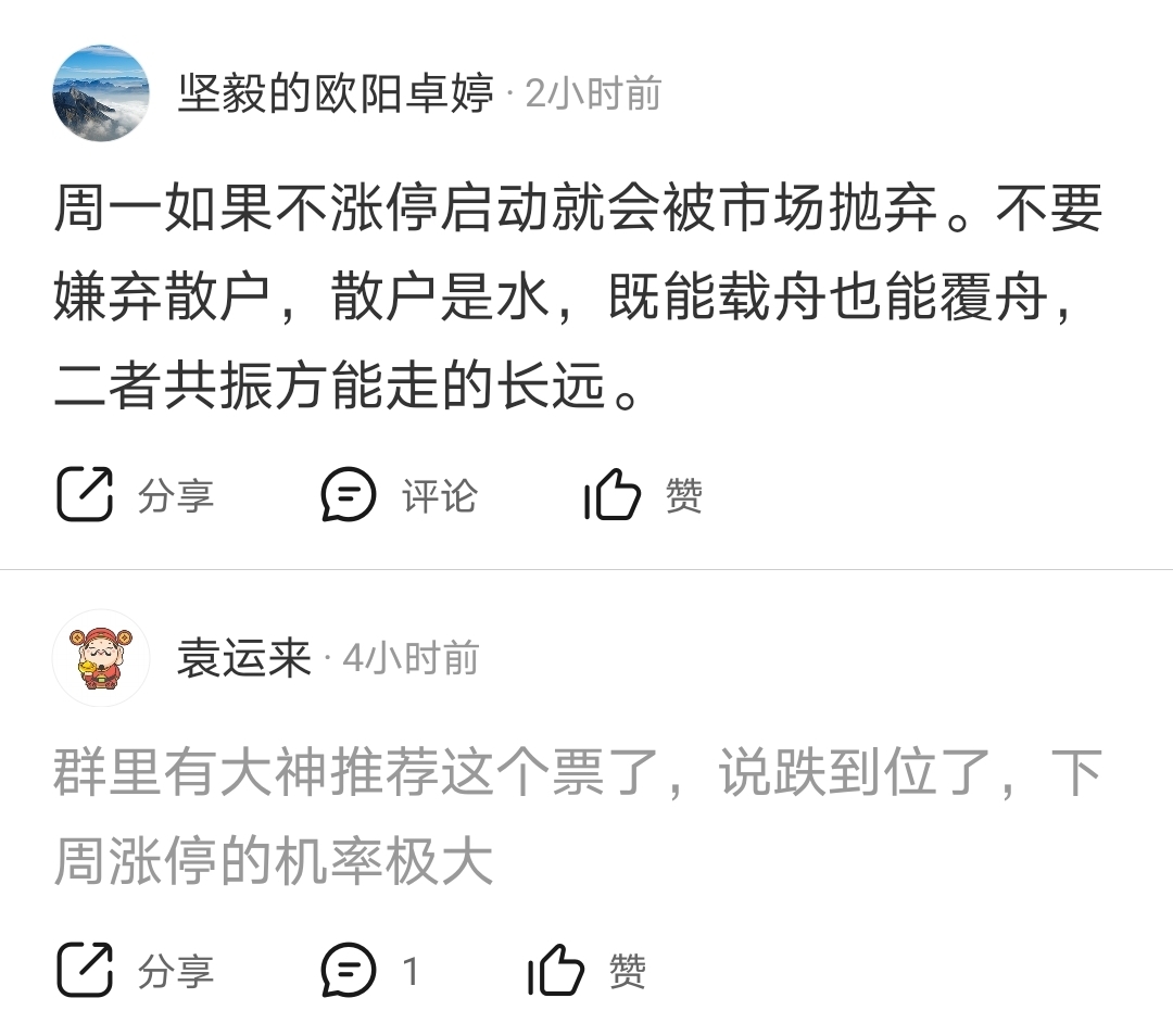 温馨提示: 1.根据《证券法》规定,禁止编造、传播虚假信息或者误导性信息,扰乱证券市场;2.用户在本社区发表的所有资料、言论等仅代表个人观点,与本网站立场无关,不对您构成任何投资建议。用户应基于自己的独立判断,自行决定证券投资并承担相应风险。《东方财富社区管理规定》