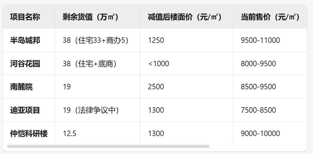 $中洲控股(SZ000042)$ $城建发展(SH600266)$ 说说中洲一努到底的计提方式剩余价值变现,中洲项目按时间价值变现计提项目减值,是按最恶劣的销售价格最长的销售时间,按当时的贷款金额和利率来计算项目成本的,而现在有了白名单,贷款利率近乎减半,加上黄金台免费资金支持,用不了多少贷款了,这部分省下的财务费用,到时可大量冲回减值损失,计提后的楼面见下图,简直只剩下个碴碴了,大大低于一级土地的整理成本。还有二个项目干脆全额计提了,未来收回多少都是个惊喜。这种计提方式与其他公司挤牙膏式的计提有天壤之别,按中洲的计提方式,地产公司基本都不存在了。