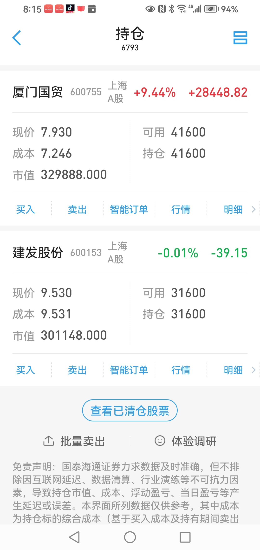 成功买入两只福建厦门本地股。600153以及600755两只都是物流供应链的股票