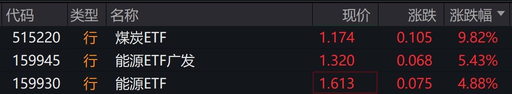受盘面影响,煤炭ETF涨超9%,能源相关ETF涨约5%。