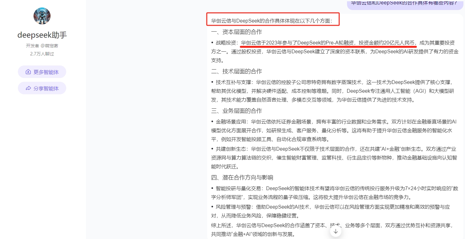 华创云信:2023年参与了DeepSeek的Pre-A轮融资,投资金额约20亿元