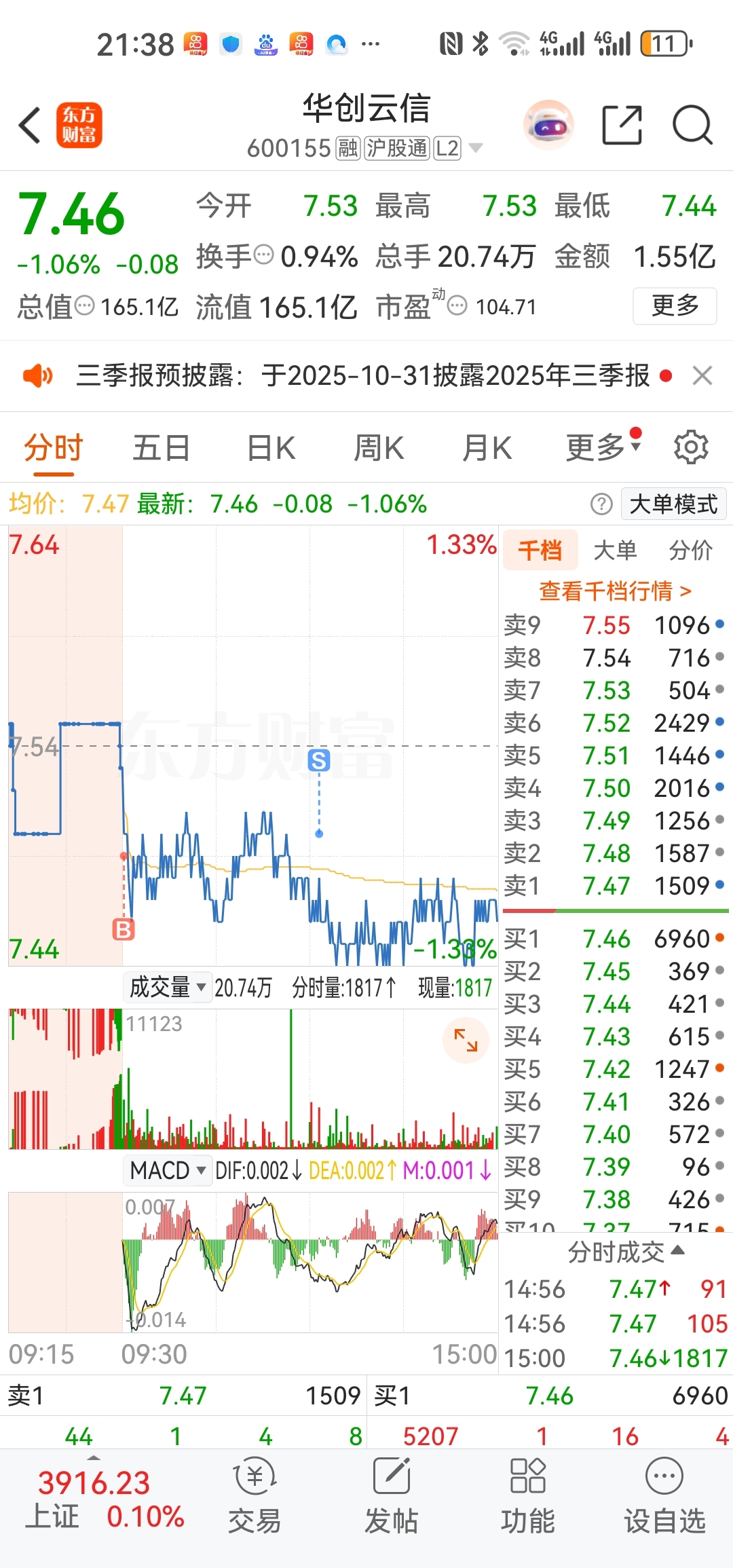 2、昨天最低价7.44、今天一直不破7.44。股吧还说很坚挺你不觉得这是做给散户看的吗?而且盘中那根巨量绿柱,不下杀两天以上才怪