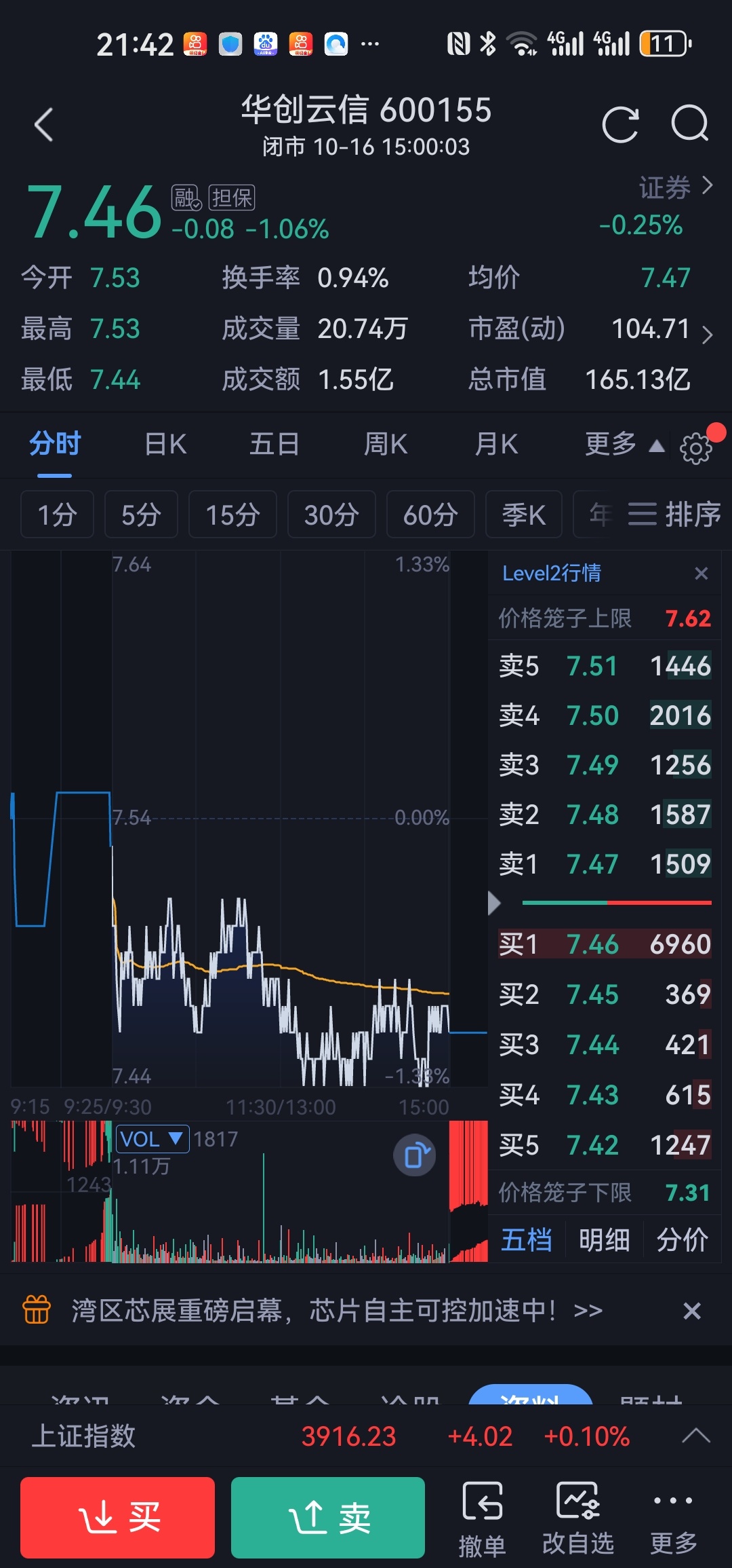 1、下午开盘后一直在7.46~7.48间波动,而且整个下午都没越过7.48。而我13:05挂7.50怎么成交了,当时的成交分时图还是根虚线?