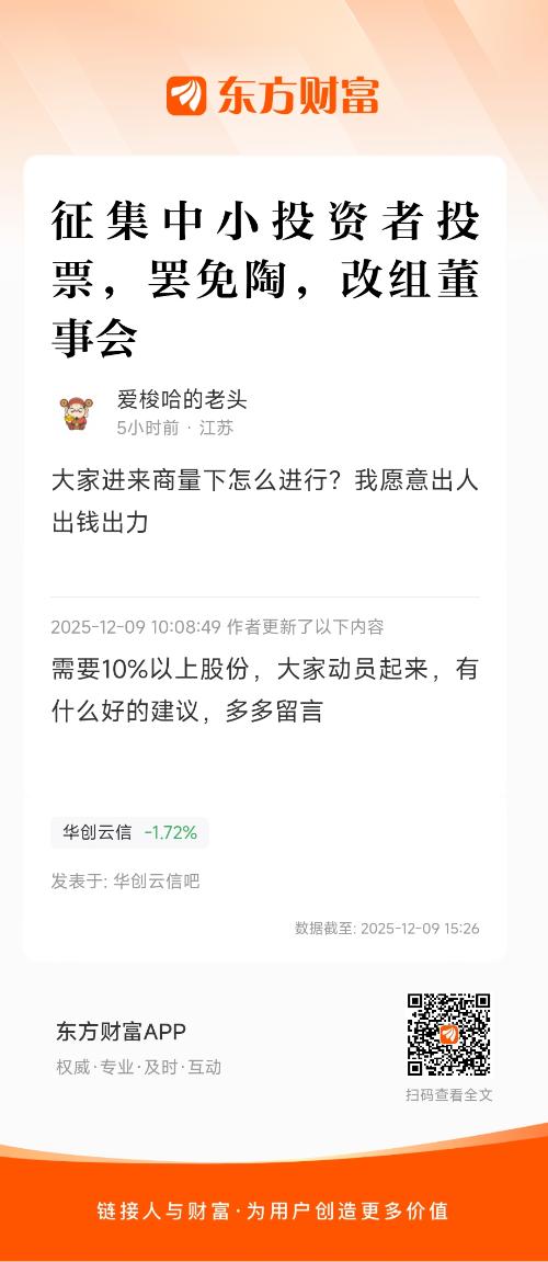 温馨提示: 1.根据《证券法》规定,禁止编造、传播虚假信息或者误导性信息,扰乱证券市场;2.用户在本社区发表的所有资料、言论等仅代表个人观点,与本网站立场无关,不对您构成任何投资建议。用户应基于自己的独立判断,自行决定证券投资并承担相应风险。《东方财富社区管理规定》