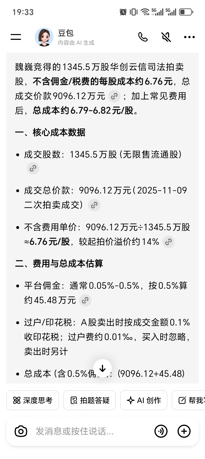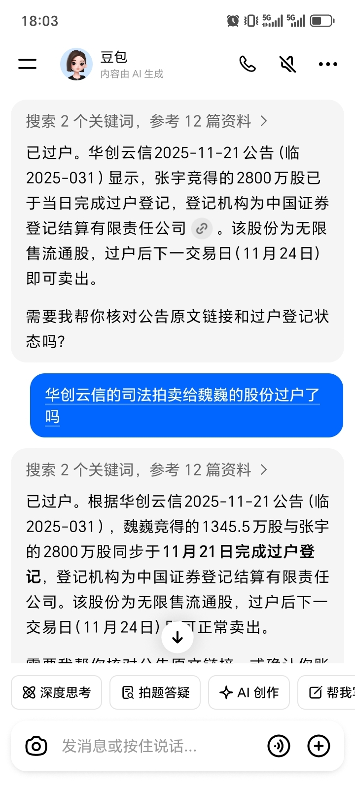 $华创云信(SH600155)$ 两大牛散张宇、魏巍网络法拍的股份已过户他们的名下了,张宇成本价大约6.66;魏巍成本价大约6.88。