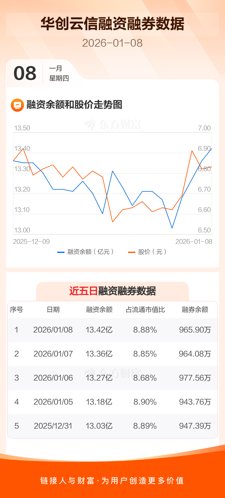 交易所最新数据显示,华创云信于2026年1月8日获融资买入3635.21万元,融资偿还3007.41万元,当日融资净买入627.8万元。目前,该股融资余额13.42亿,占流通市值比例为8.88%。