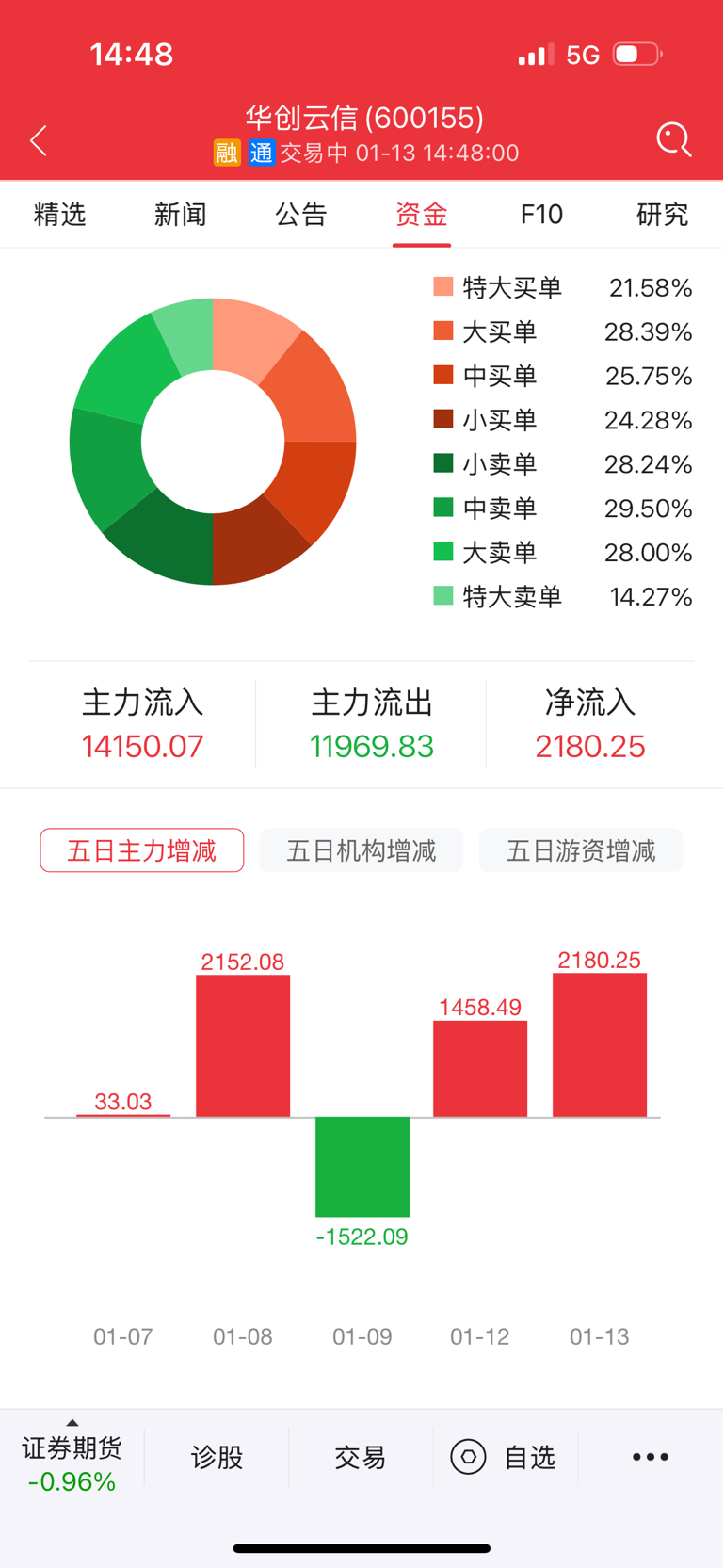 $华创云信(SH600155)$ 资金流入,拿好了呀,不能被洗出来了
