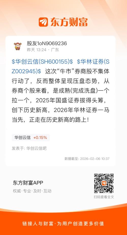 $华创云信(SH600155)$ $华林证券(SZ002945)$ 这次“牛市”券商股不集体行动了,反而整体呈现压盘态势,从券商个股来看,是成熟(完成洗盘)一个拉一个,2025年国盛证券拔得头筹,创下历史新高,2026年华林证券一马当先,正走在历史新高的路上!
