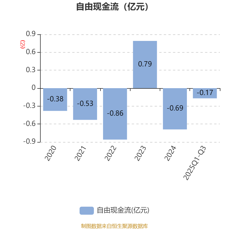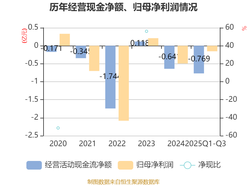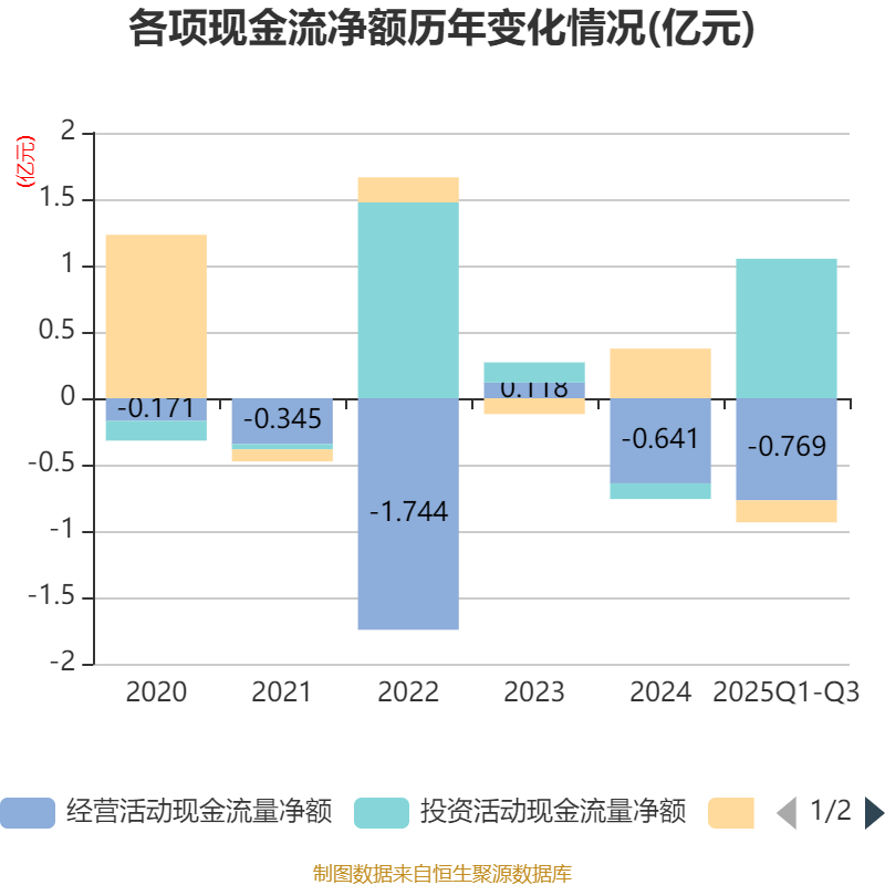 2025年前三季度,公司经营活动现金流净额为-7691.84万元,同比减少2364.01万元;筹资活动现金流净额-1657.28万元,同比减少4788.4万元;投资活动现金流净额1.05亿元,上年同期为-2028.95万元。