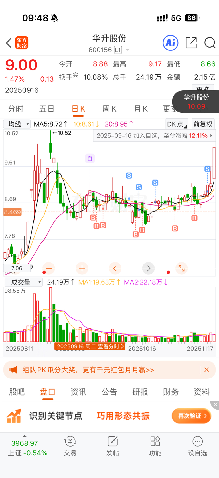 $华升股份(SH600156)$ 9.16 加自选 9.17 买入,到 11.17 涨停一!坚持就是胜利!