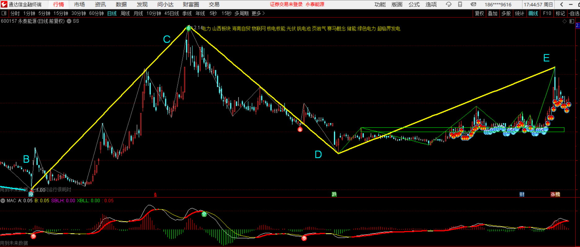 二、点B之后的日线结构:点D之后己经延伸出一个笔中枢,点E之后的回调只要不回下面的绿色中枢就是笔中枢的三买。当下日线MACD并不有死叉,但60分己接近水上金叉。