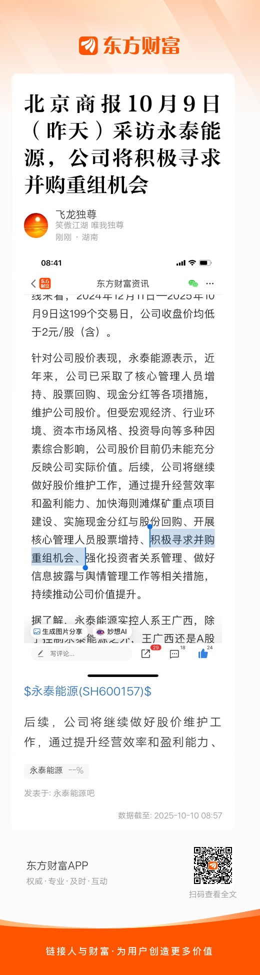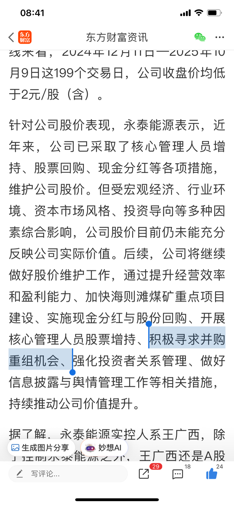 后续,公司将继续做好股价维护工作,通过提升经营效率和盈利能力、加快海则滩煤矿重点项目