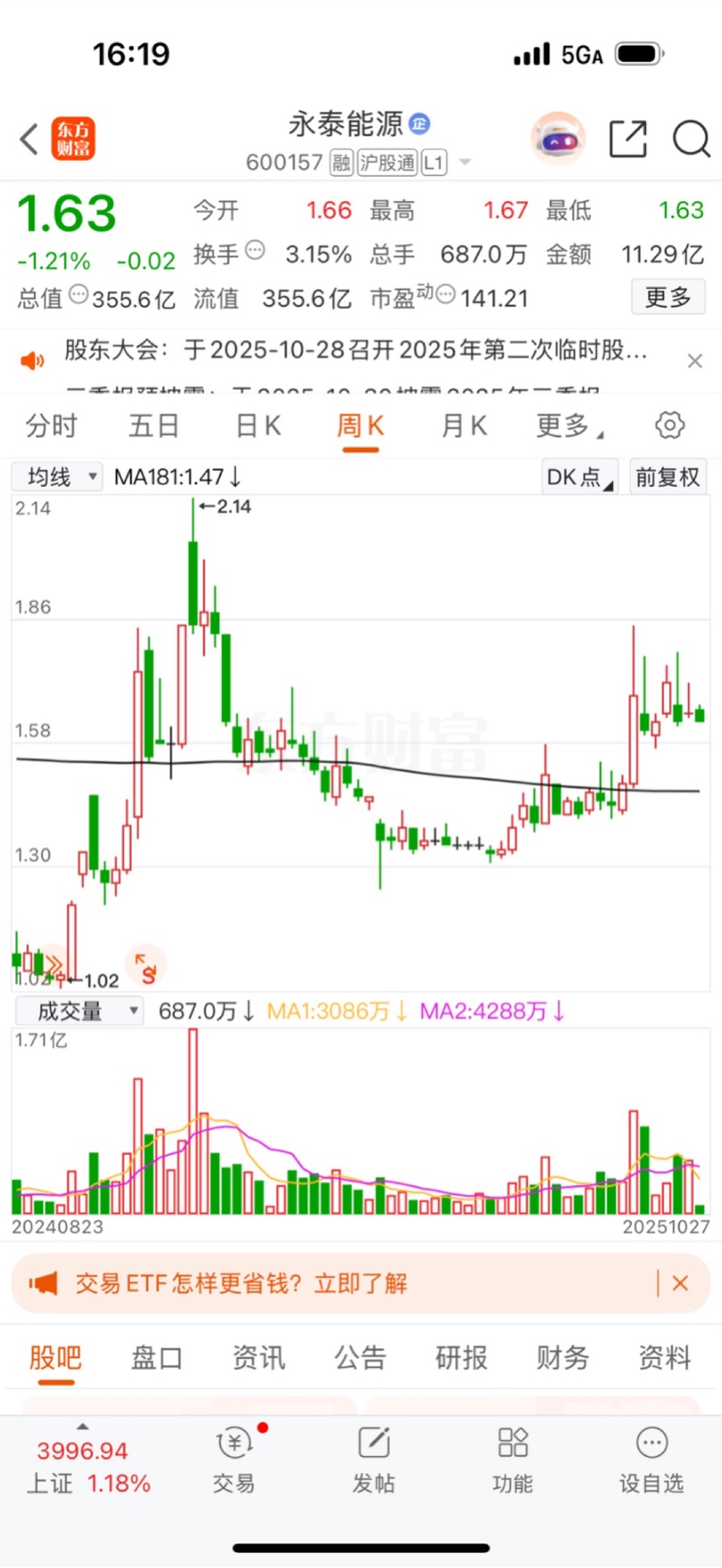 $永泰能源(SH600157)$ 日线还是看1.60的支撑。企稳再说。周线上看在1.47。