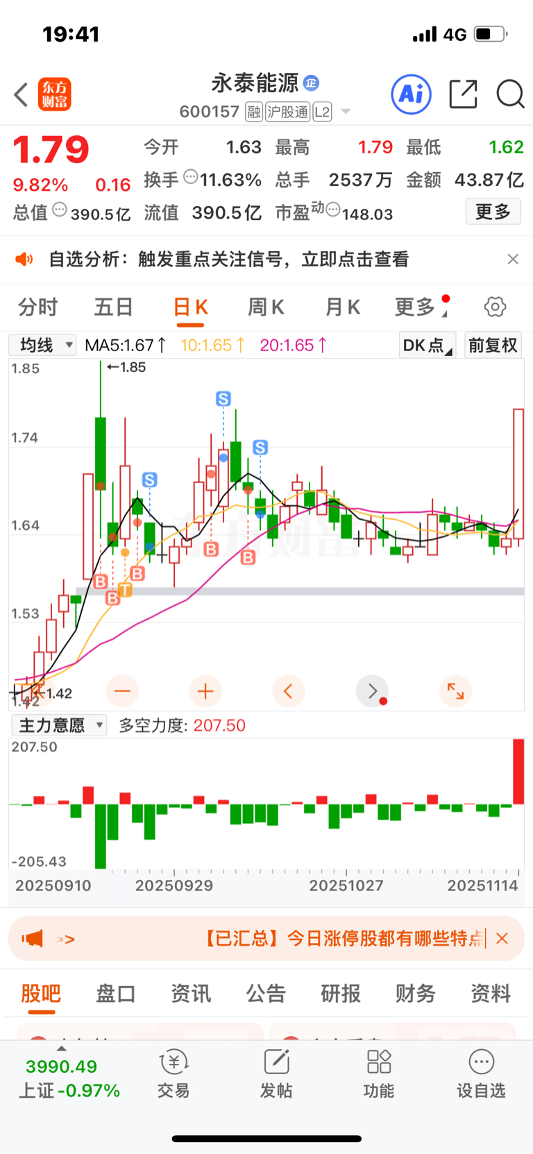 $永泰能源(SH600157)$ 这个票我是吃了大肉的,看着这段时间一直无波动就没怎么关注,结果今天拉得这么猛
