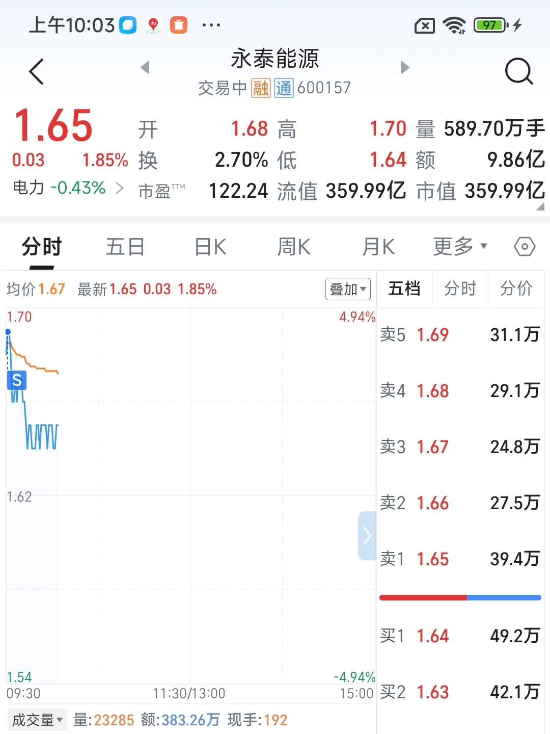 $永泰能源(SH600157)$ 昨天1.63朱力不收,今天全收了