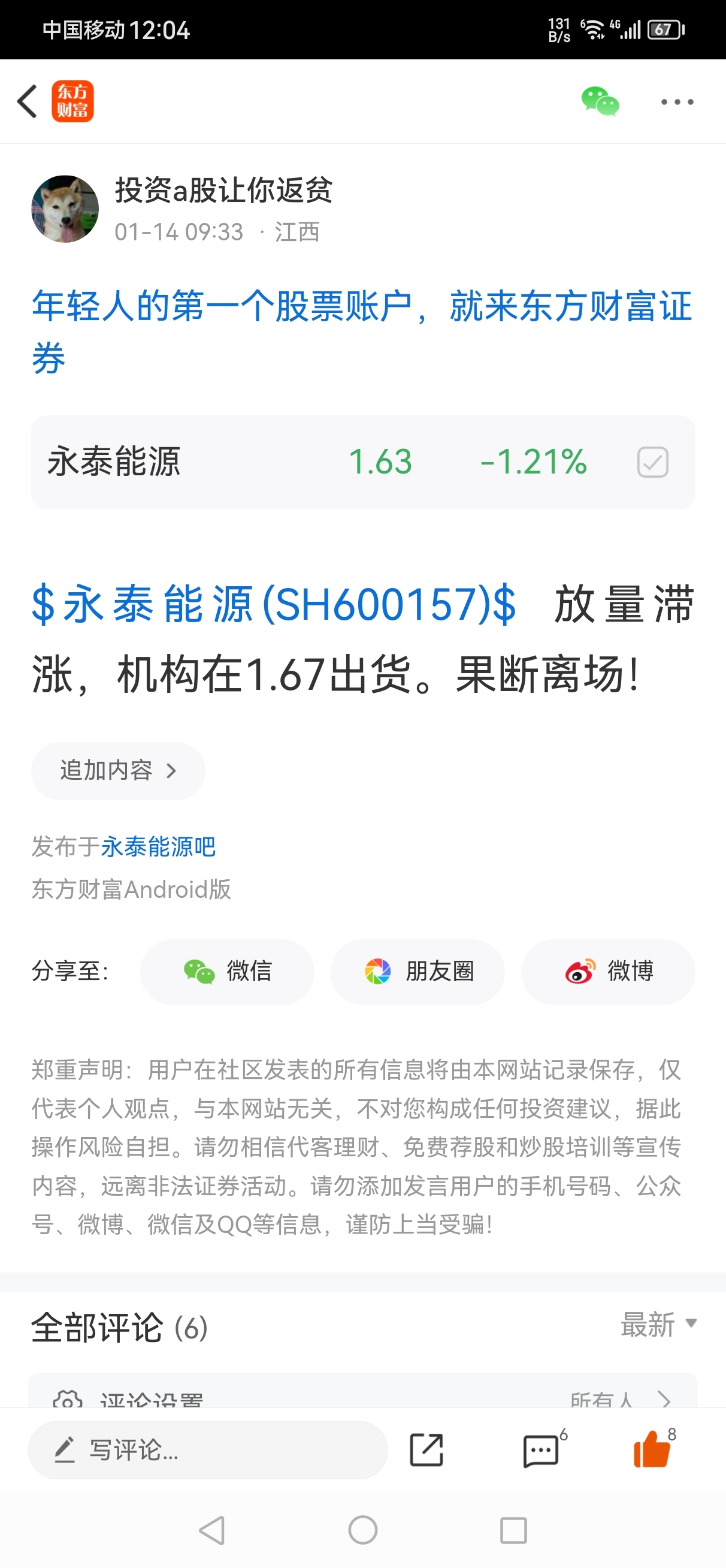 温馨提示: 1.根据《证券法》规定,禁止编造、传播虚假信息或者误导性信息,扰乱证券市场;2.用户在本社区发表的所有资料、言论等仅代表个人观点,与本网站立场无关,不对您构成任何投资建议。用户应基于自己的独立判断,自行决定证券投资并承担相应风险。《东方财富社区管理规定》