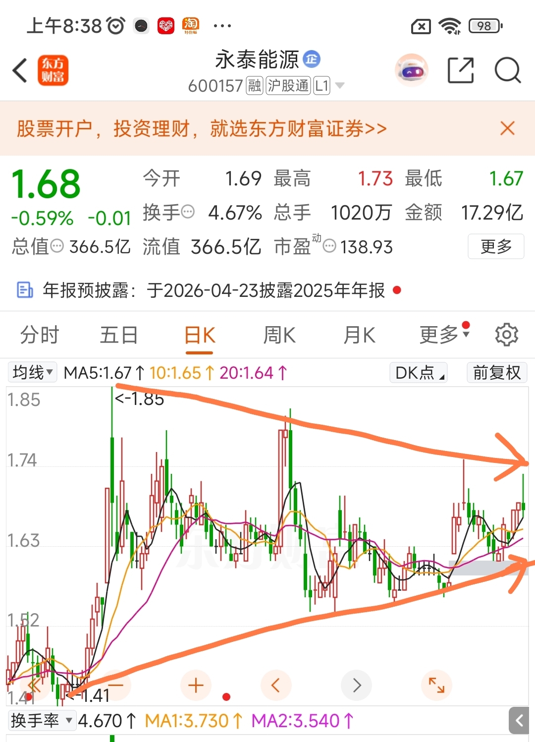 $永泰能源(SH600157)$ 三角形整理(马后炮画图)离尾端越来越近了,临近春节不知是要挖坑还是向1.85箱顶冲