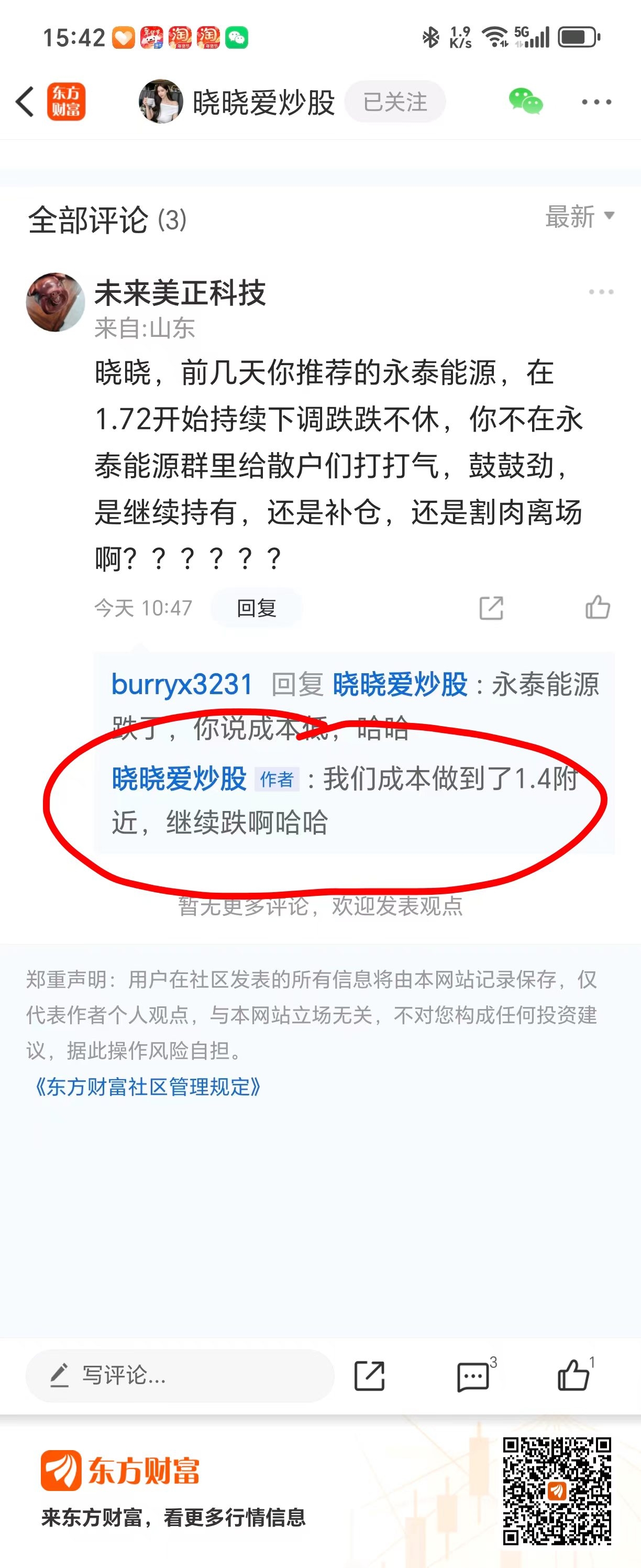 $永泰能源(SH600157)$ 永泰能源股吧里朋友们,让你们看看"晓晓爱炒股"此人的真实面目,鼓吹上1.8,上2.0以上,现在跌下来了,又说自己的成本是1.4,还希望继续跌,真有这样的动物种类么?所以说,是跌是涨,大家要各自分析自己看好股票的基本面,买卖自由。