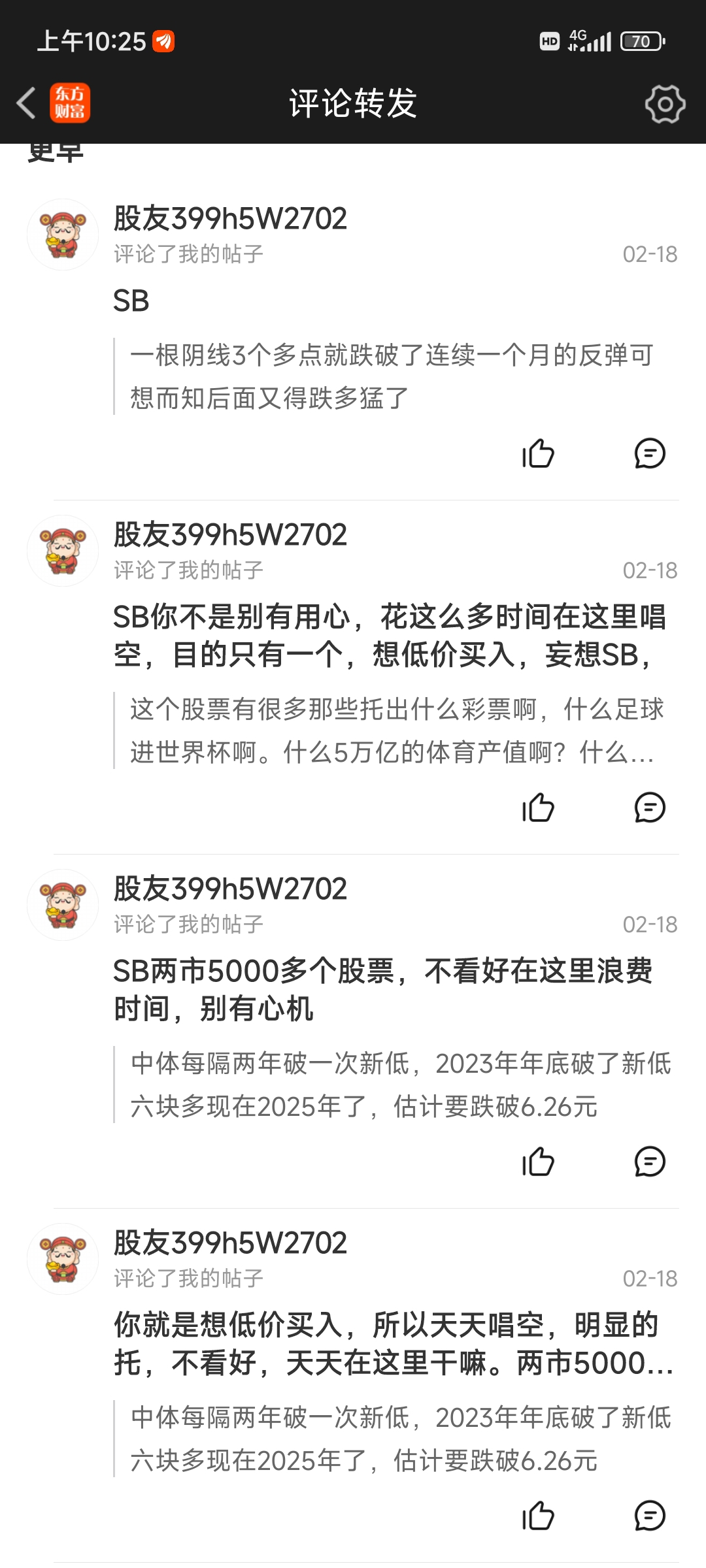 遇到这种傻缺一直在下面什么阴谋论,什么幻想狂的,我真的是不想回答我只想说尊重事实,敬畏市场中体为什么表现这么差自然有他的原因要知道2023年年初2800点中体是八块多的股价以前更不用说了现在可是3300点,为什么它只有七块多?为什么年报在一季报增长以后没有预告?我跟你们说2025年一季报百分百爆雷,因为没有房地产结算
