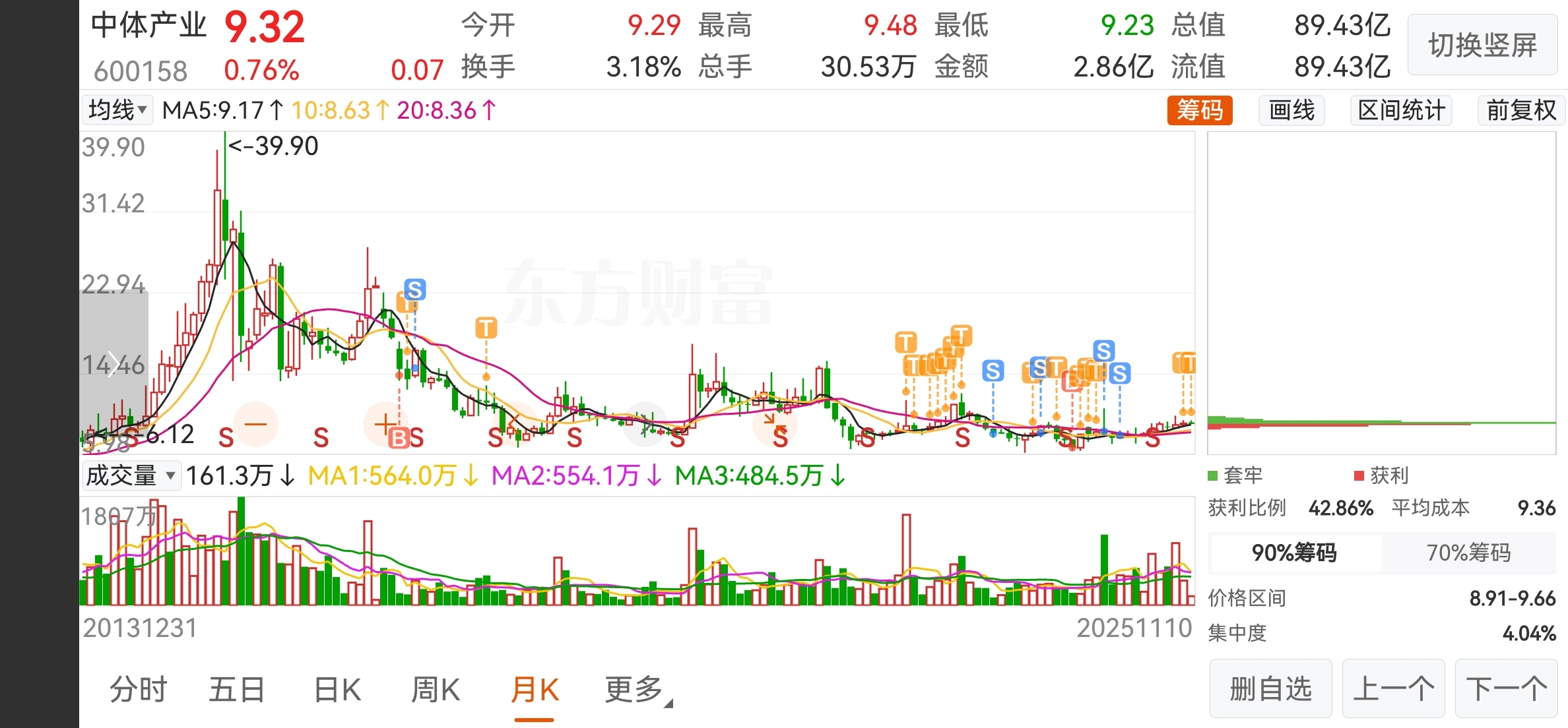 $中体产业(SH600158)$ 这股被我T的已经不亏钱了,今天9.44卖,9.33又接回来了。明天估计有3个点涨幅,最近会有一个涨停,均线多头排列,不用怀疑。