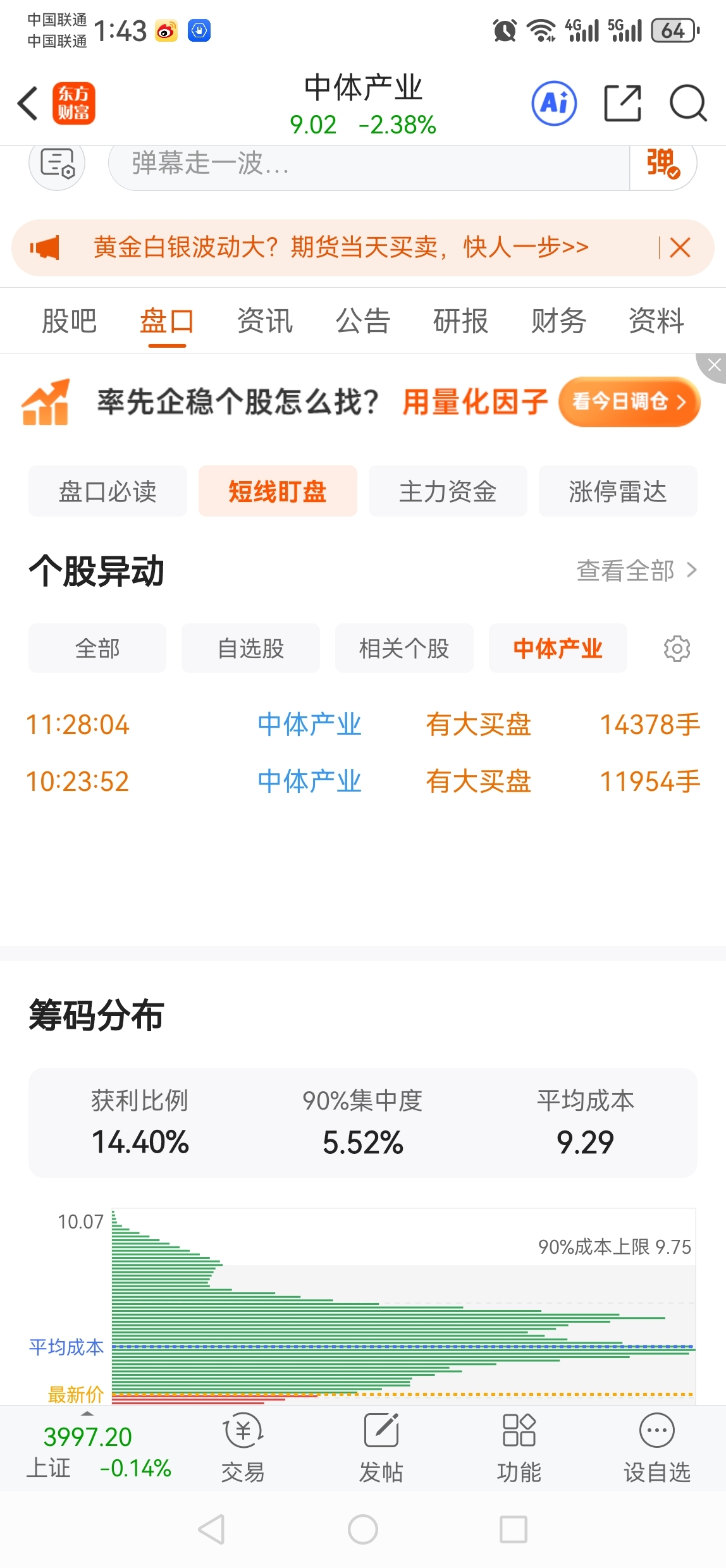 $中体产业(SH600158)$ 中体产业今天居然个股异动,两个万手的买单